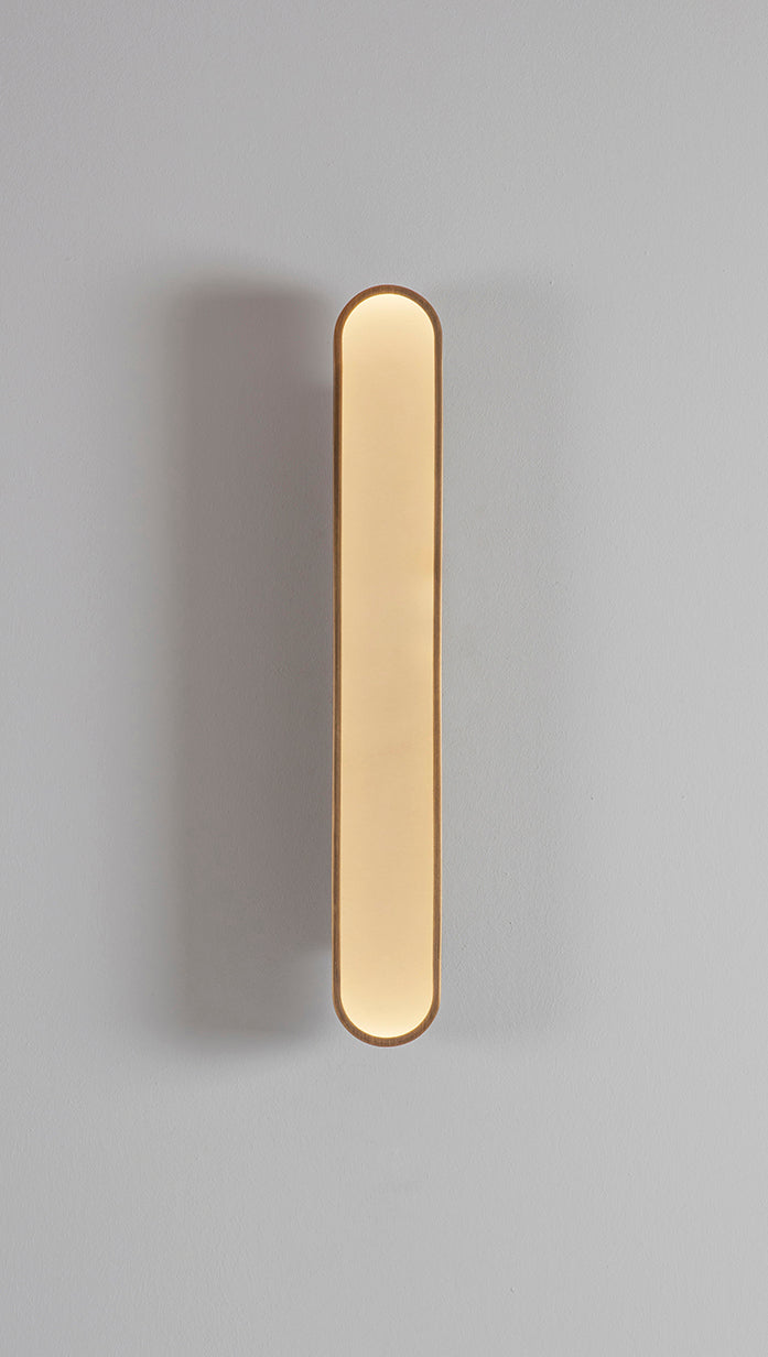 Applique murale rectangulaire parfaitement arrondie. Fixée au mur avec une plaque arrière de même forme, elle est en métal. Modèle présenté en laiton moyen et diffuseur en verre opaque.