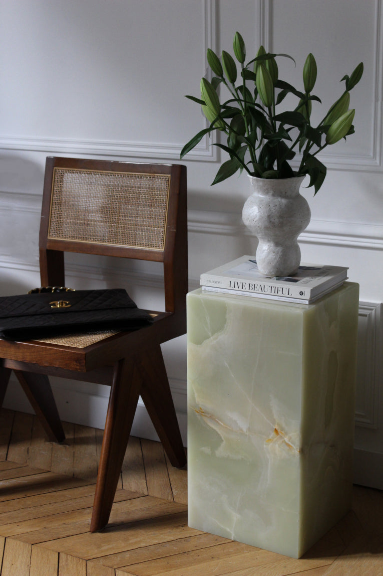 Minimalistisk onyx sokkel med 5 sider. Kan brukes som sidebord, nattbord, krakk eller som et enkelt dekorativt element. Gi interiøret ditt et unikt designpreg.